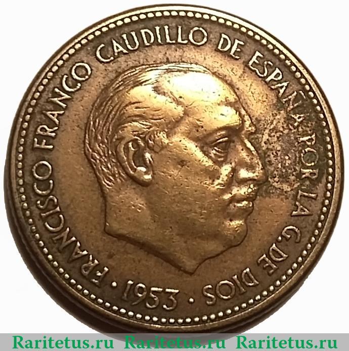 Слева, сверху и справа вдоль канта надпись на испанском языке: "FRANCISCO FRANCO CAUDILLO DE ESPAÑA POR LA G. DE DIOS" - "ФРАНСИСКО ФРАНКО БОЖЬЕЙ МИЛОСТЬЮ КАУДИЛЬО ИСПАНИИ". В центре - его профильный портрет вправо. Снизу - год выпуска: "1953". По краям канта расположены рельефные элементы в виде точек.