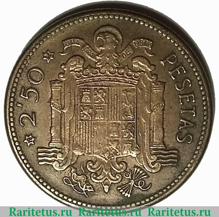 В центре изображён герб Испании от 1945 года. Слева - число: "2'50", справа - песета на испанском языке: "PESETAS". По краям канта расположены рельефные элементы в виде точек.