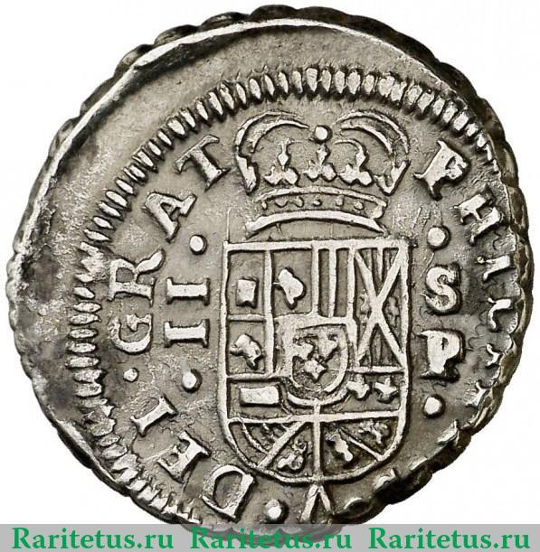 В центре - герб страны в виде щита, над ним корона. Слева - римская цифра 2: "II", справа - знак монетного двора Севильи: "SP". Справа, снизу и слева вдоль канта надпись на латинском языке: "PHILIPPVS V DEI GRAT" - "ФИЛИПП V БОЖЬЕЙ МИЛОСТЬЮ".