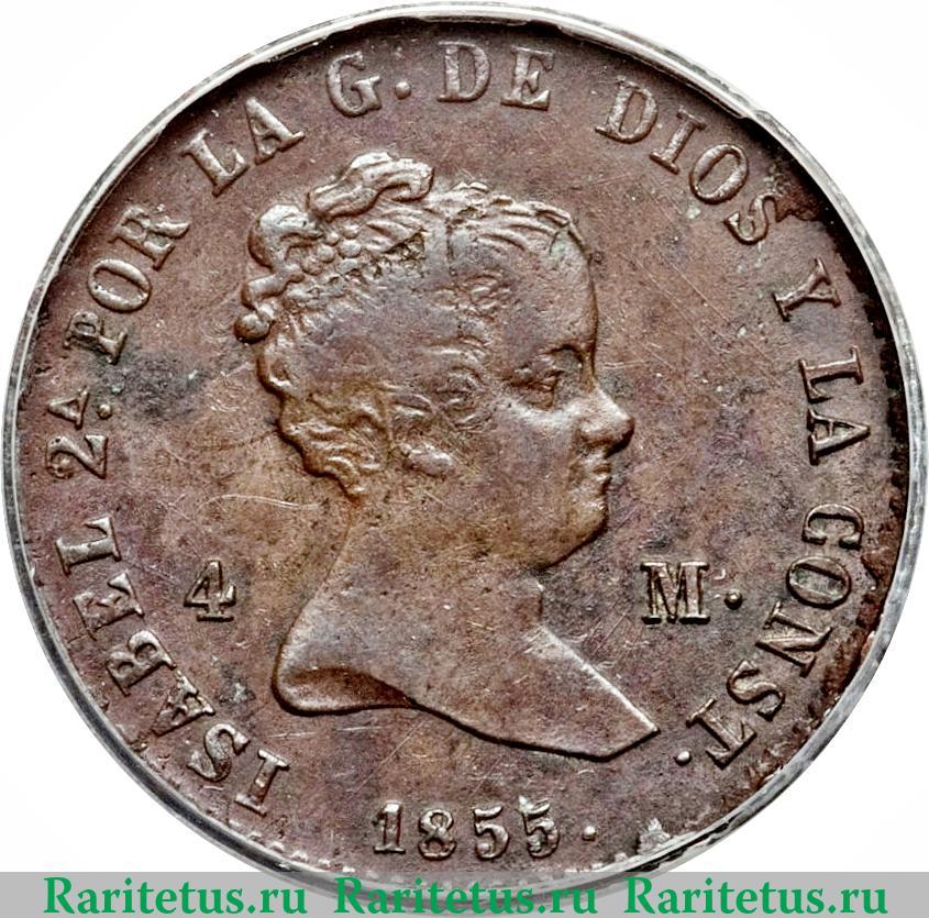 Сверху вдоль канта надпись на испанском языке: "ISABEL II POR LA GRACIA DE DIOS Y LA CONST." - "ИЗАБЕЛЛА II БОЖЬЕЙ МИЛОСТЬЮ И ПО КОНСТИТУЦИИ". В центре - профильный портрет вправо королевы Изабеллы Второй. Слева от неё - цифра: "4", справа - знак монетного двора Мадрида: "М". Снизу - год выпуска: "1855".