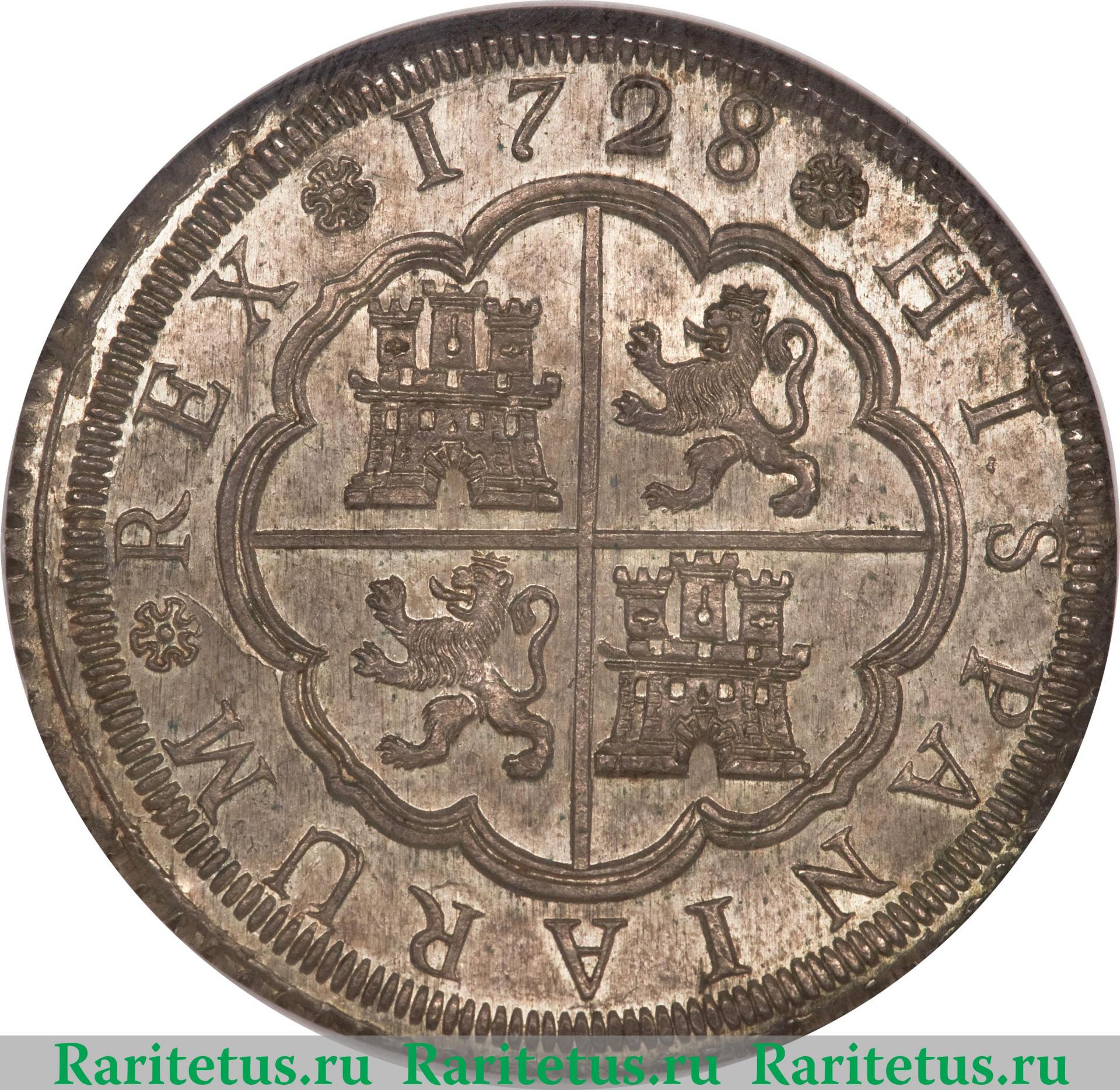 Вдоль канта надпись на лат. яз.: "HISPANIARVM REX" - "ИСПАНСКИЙ КОРОЛЬ". Сверху - год выпуска: "1728". В центре изображён крест, по сторонам которого изображены 2 льва и 2 башни. По краям канта расположены рельефные элементы в виде зубцов.