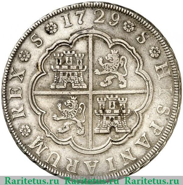 Аверс монеты 8 реалов 1729-1730 годов Испания