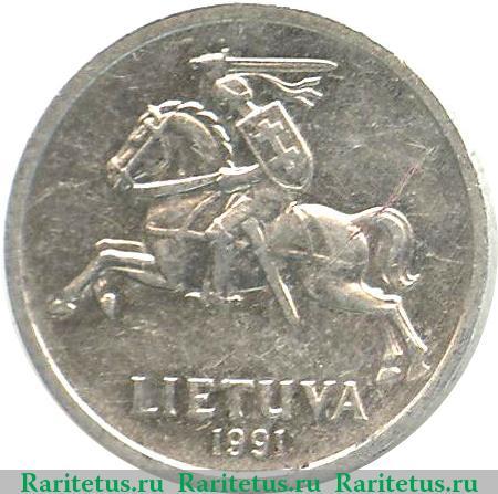 В центре герб Литовской Республики. Под гербом название страны на литовском языке: «LIETUVA». Снизу вдоль канта год выпуска 1991.