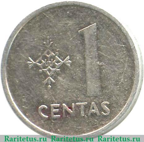 В центре цифра «1», под ней надпись на лит. языке: «CENTAS» - 1 цент. Слева от цифры декоративный узор, выполненный в национальных традициях.