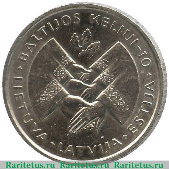 В центре в окружности меньшего диаметра шесть попарно держащихся рук, рукава их костюмов украшены национальным орнаментом. Над ними ветка из трех дубовых листьев. По окружности канта надпись на лит. языке: «BALTIJOS KELIUI-10. ESTIJA. LATVIJA. LIETUVA», которая переводится как: «Балтийский путь – 10 лет. Эстония. Латвия. Литва». Надписи разделены четырьмя четырехконечными звездами.
