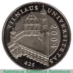В центре в полуокружности меньшего диаметра вид сверху на здание университета в г. Вильнюс. Справа от него вертикально год выпуска 2004. Сверху и справа вдоль канта надпись на лит. языке: «VILNIAUS UNIVERSITETAS», которая переводится как: «Вильнюсский университет». Снизу вдоль канта число: «425» - возраст университета.