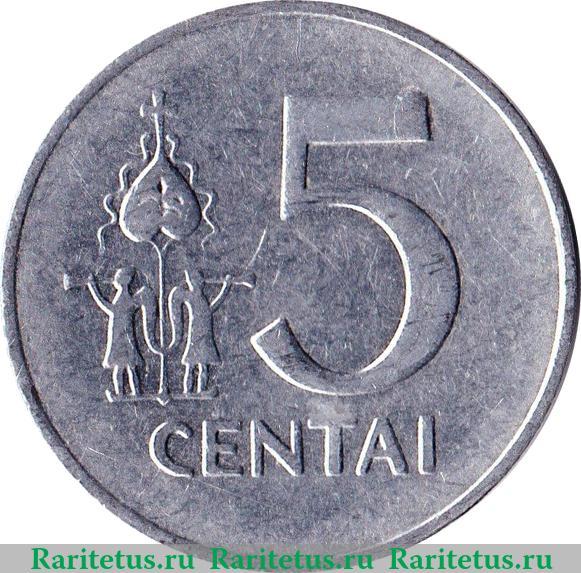 В центре цифра «5», под ней надпись на лит. языке: «CENTAI» - 5 цента. Слева от цифры декоративный узор, выполненный в национальных традициях.