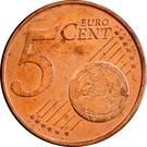 В центре цифра: 5. Сверху и справа от неё надпись на английском языке в вде строки: EURO CENT - евроцент. Под ней стилизованное изображение Земного шара на фоне шести прямых линий, на концах которых 12 пятиконечных звёзд, символизирующих 12 стран-членов Европейского Союза.