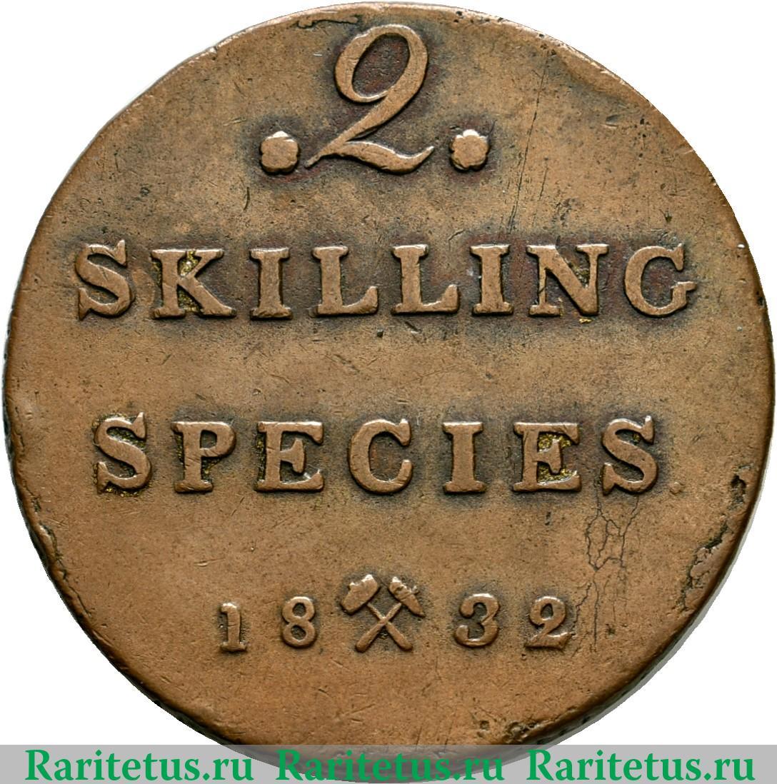 В центре цифра: 2, обрамлённая розетками. Под ним надпись на норвежском и датском языках: «SKILLING SPECIES» - скиллинг и год выпуска: 1832, разделённый литерой монетного двора г. Конгсберг - скрещенным молотом и киркой.