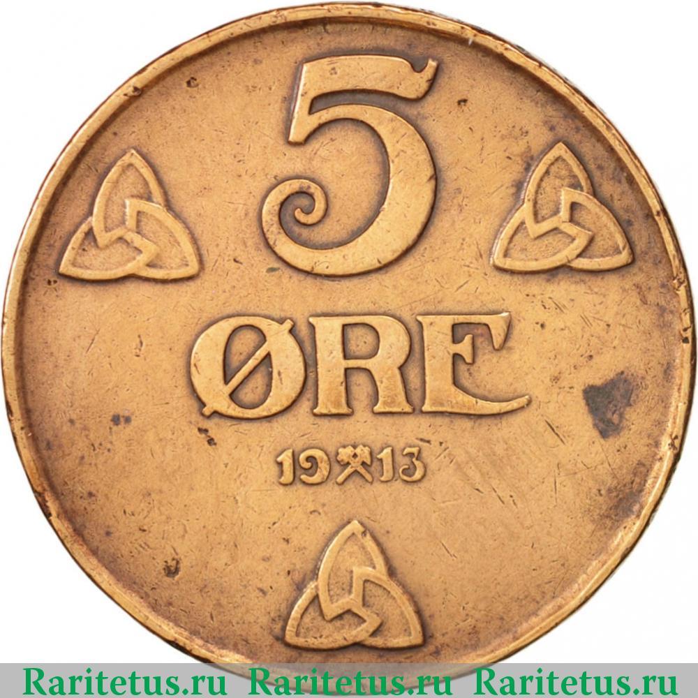 Реверс монеты 5 эре (ore) 1913 года Норвегия
