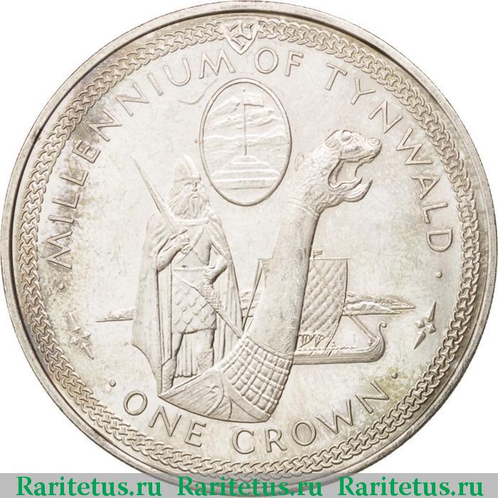 Изображёны: драккар и викинг. Надписи: ·MILLENNIUM OF TYNWALD·ONE CROWN·.