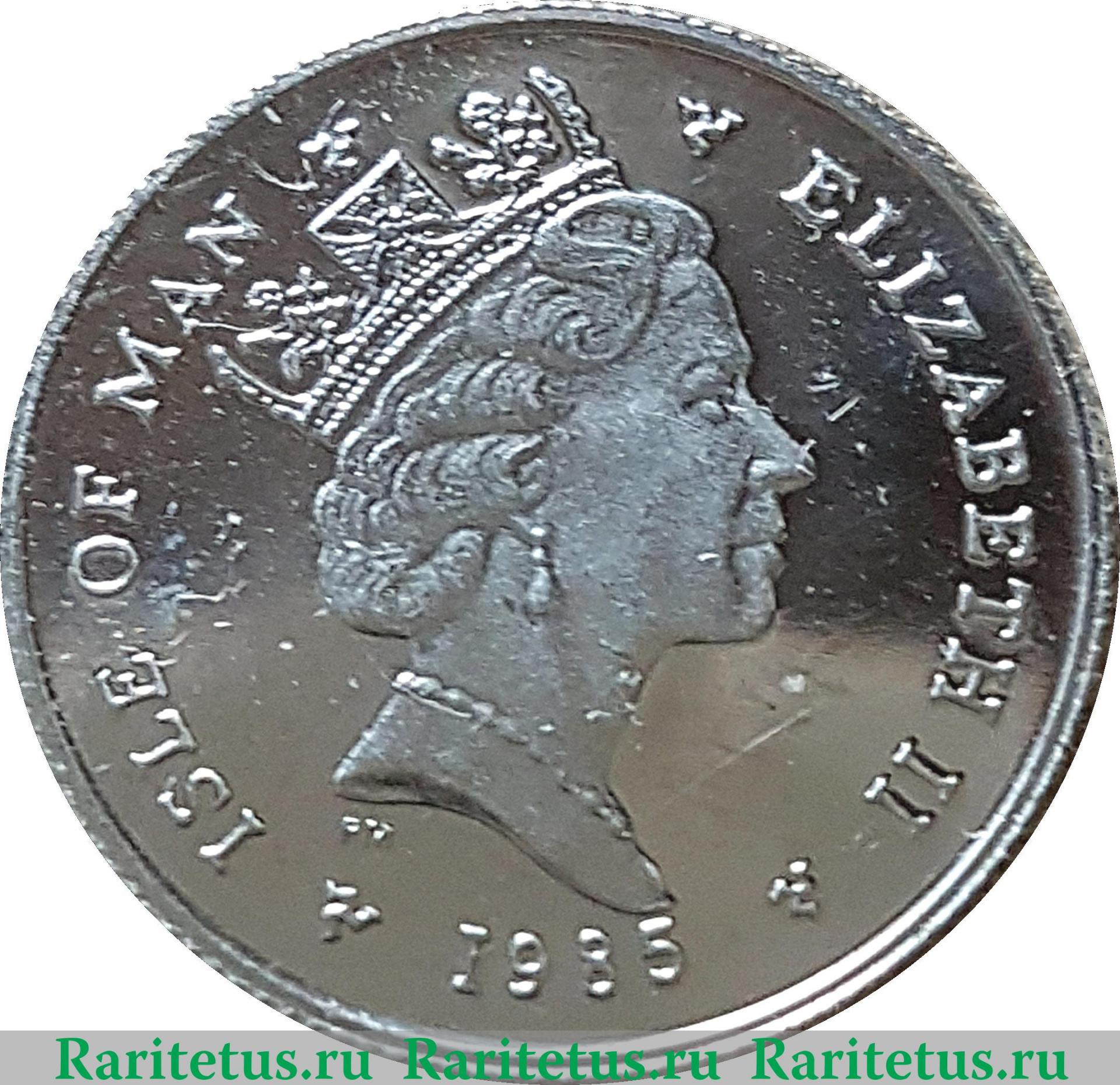 Слева вдоль канта надпись на английском языке: «ISLE OF MAN», которая переводится, как: «Остров Мэн». Справа вдоль канта надпись «ELIZABETH II», которая переводится с английского как «Елизавета II». Надписи и год разделены изображениями трискелиона (символа о. Мэн). В центре профильный портрет королевы Елизаветы II, обращённый вправо. Под срезом плеча монограмма «РМ» - знак монетного двора Pobjoy Mint. Снизу вдоль канта год выпуска 1985.