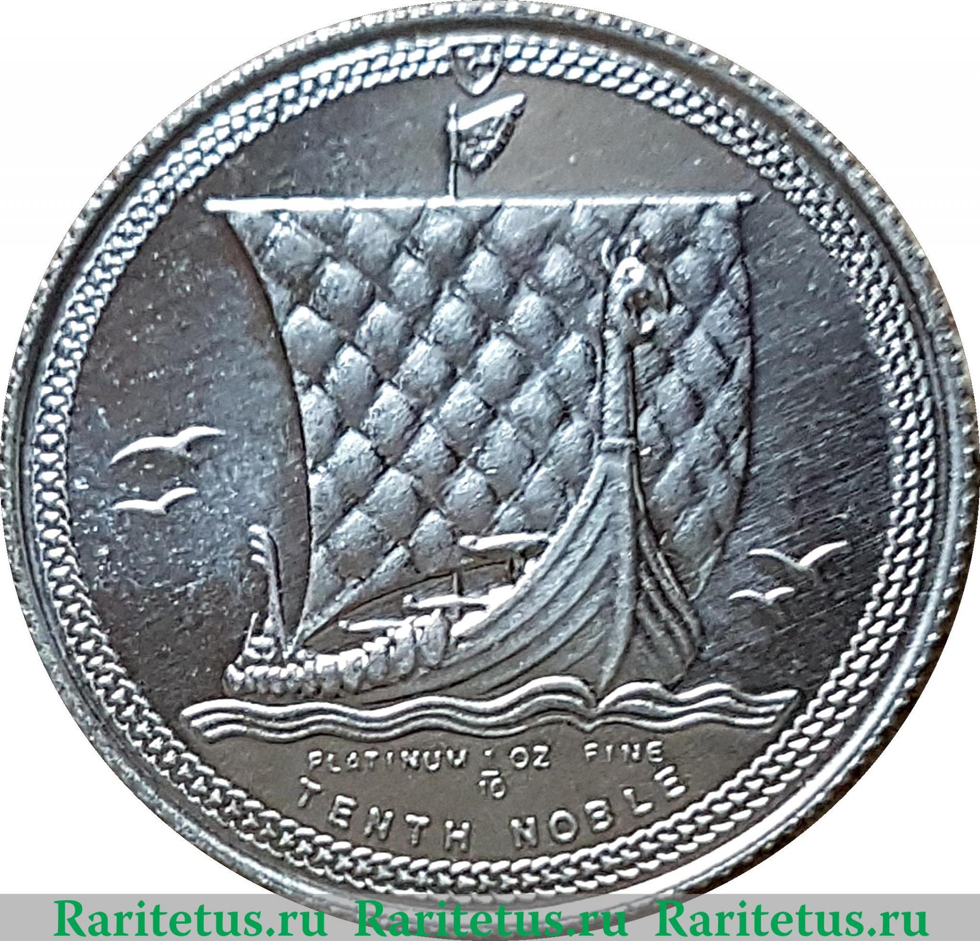 В центре изображение старинного одномачтового парусного судна, плывущего по морю вперед. Сверху вдоль канта надпись на английском языке: «PLATINUM 1/10 OZ FANE», которая переводится, как: «Платины 1/10 унции». Снизу, отделенная точками, надпись на англ. яз.: «TENTH NOBLE» - 1/10 нобля. По окружности канта декоративный элемент в виде витой цепи, в верхней части которой изображен герб острова.