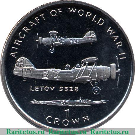 Изображены сбоку два летящих над землей самолета времен Второй мировой войны: по центру самолет вправо, над ним – влево. Под фюзеляжем название фирмы производителя и модификация самолета «Letov S 328». Вдоль канта надписи на английском языке: сверху «AIRCRAFT OF WORLD WAR II» (Авиастроение Второй мировой войны), снизу в две строки - «1 CROWN» (1 Крона).