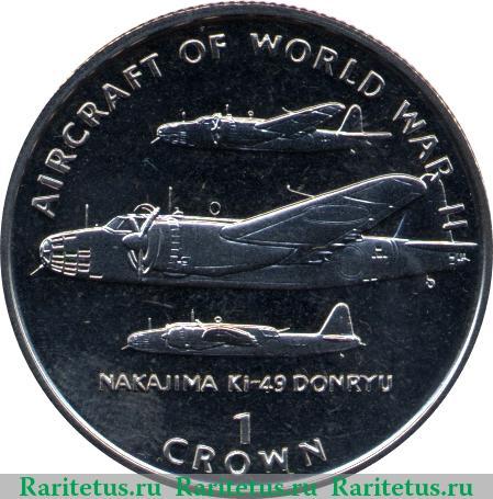 Изображены влево три летящих самолета времен Второй мировой войны: по центру крупное изображение, сверху и снизу изображение меньшего размера. Под изображением горизонтально название завода и маркировка самолета на английском языке «NAKAJIMA Ki-49 DONRYU» (Накадзима Ki-49 Донрю). Вдоль канта надписи на английском языке: сверху «AIRCRAFT OF WORLD WAR II» (Авиастроение Второй мировой войны), снизу в две строки - «1 CROWN» (1 Крона).