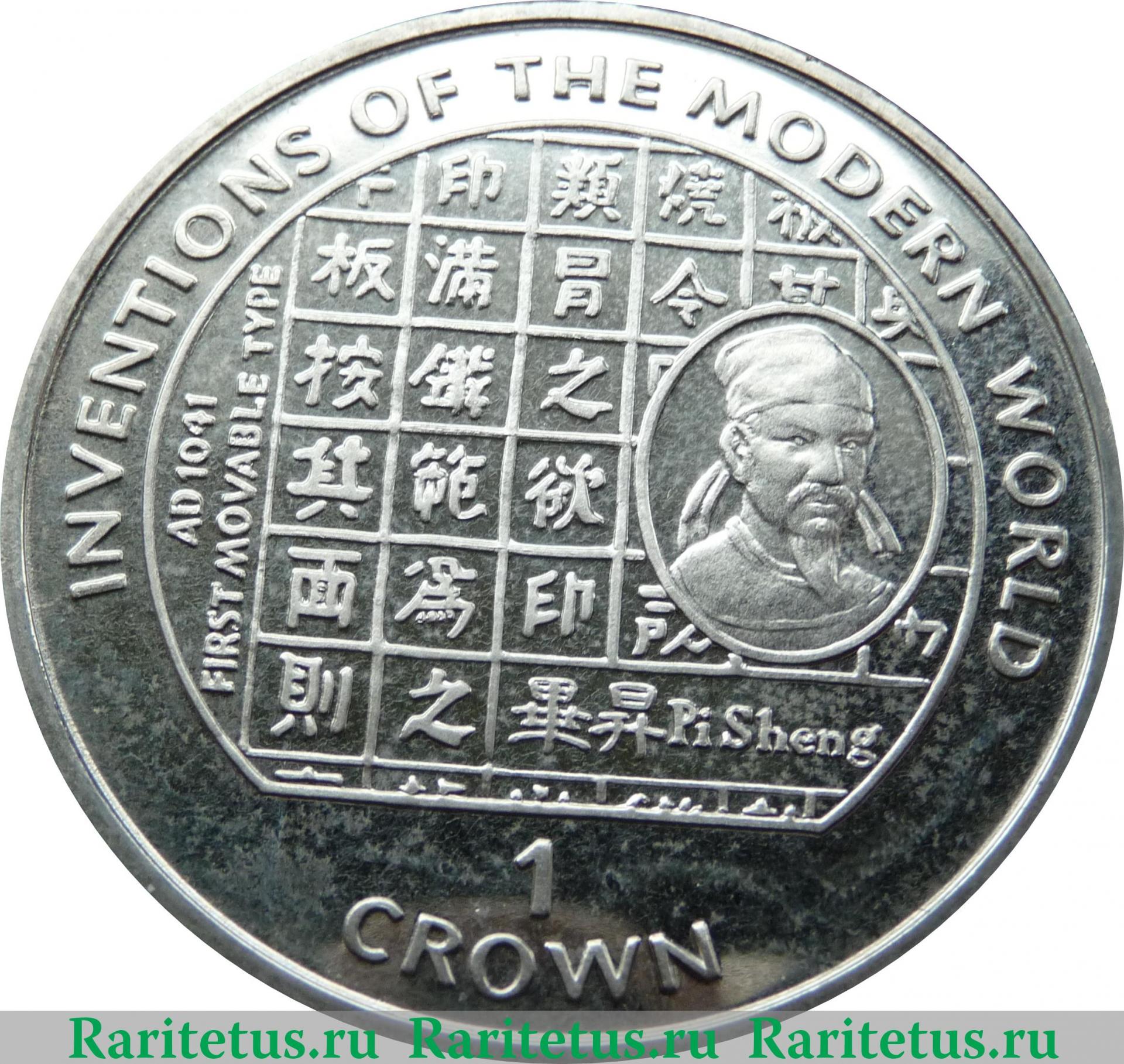 В окружности изображена рама заполненная иероглифами для печати, справа камея в ней изображен портрет изобретателя принципа наборной печати Би Шэна, под портретом его имя китайскими иероглифами «畢昇» и на английском языке «Pi Sheng». Справа вертикально надпись на английском языке «AD 1041 FIRST MOVABLE TYPE» (н.э. 1041 Первый наборный шрифт). Вдоль канта надписи на английском языке: сверху «INVENTIONS OF THE MODERN WORLD» (Изобретения современного мира), снизу в две строки «1 CROWN» (1 Крона).