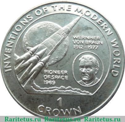 Слева изображена вправо на фоне луны ракета-носитель, под ней надпись на английском языке и год когда ракета доставила космический корабль на окололунную орбиту «PIONEER OF SPACE 1969» (Пионер Космоса 1969). Справа камея с портретом Вернера фон Брауна, над портретом имя инженера на немецком языке и годы его жизни «WERNHER VON BRAUN 1912-1977». Вдоль канта надписи на английском языке: сверху «INVENTIONS OF THE MODERN WORLD» (Изобретения современного мира), снизу в две строки «1 CROWN» (1 Крона).