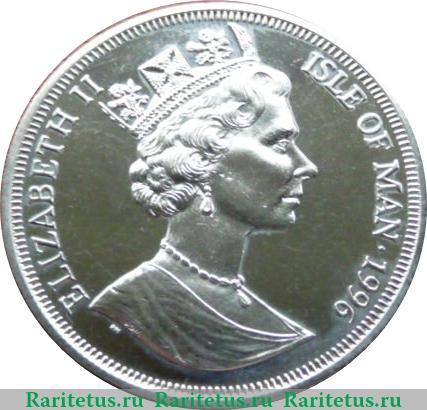По центру расположен профильный портрет вправо королевы Великобритании Елизаветы II в короне. В срезе портрета инициалы британского скульптора Raphael David Maklouf - «RDM», под срезом латинские литеры «PM» - знак монетного двора Pobjoy, графство Суррей, Великобритания. По окружности вдоль канта надписи на английском языке: слева имя монарха «ELIZABETH II» (Елизавета II) справа название коронного владения Великобритании «ISLE OF MAN» (Остров Мэн) и год выпуска «1996». Вдоль канта рельефные элементы в виде зубцов.