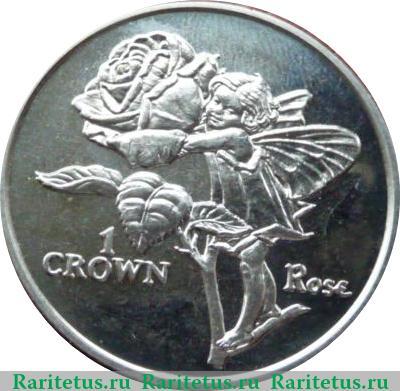 По центру изображены бутон розы и обнимающая его цветочная фея роз, стоящая на ветке. Фея одета в наряд из лепестков цветка. По обе стороны от изображения горизонтальные надписи на английском языке: слева в две строки - «1 CROWN» (1 Крона), справа название растения «ROSE» (Роза).