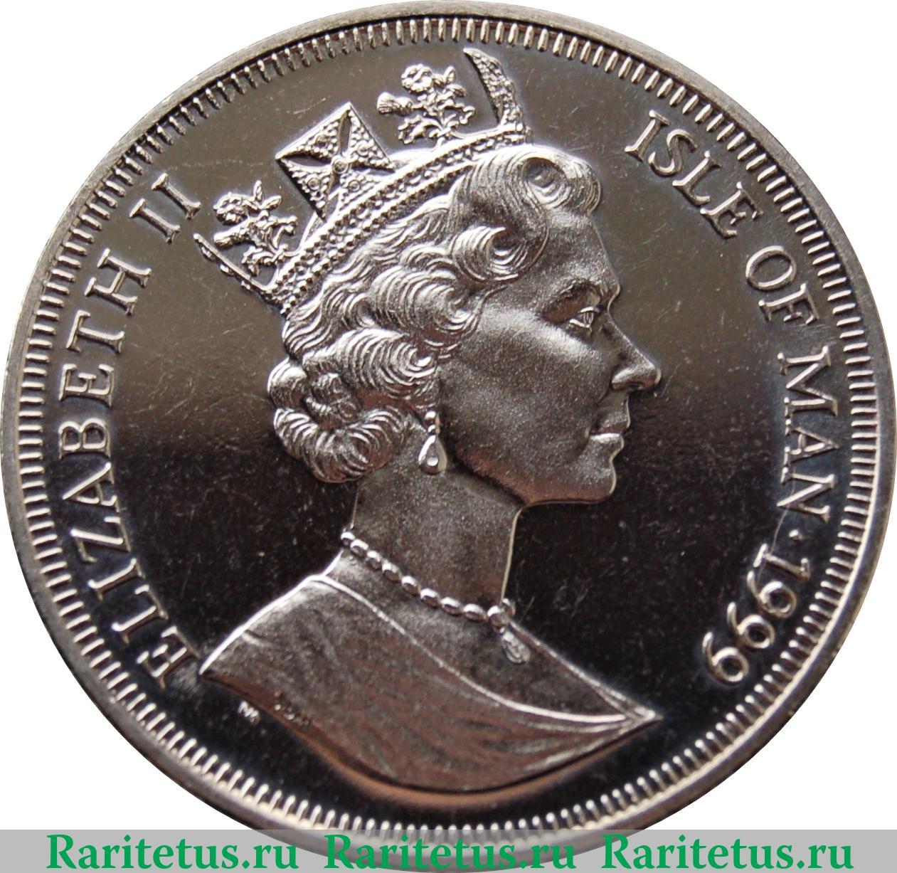 По центру расположен профильный портрет вправо королевы Великобритании Елизаветы II в короне. В срезе портрета инициалы британского скульптора Raphael David Maklouf - «RDM», под срезом латинские литеры «PM» - знак монетного двора Pobjoy, графство Суррей, Великобритания. По окружности вдоль канта надписи на английском языке: слева имя монарха «ELIZABETH II» (Елизавета II) справа название коронного владения Великобритании «ISLE OF MAN» (Остров Мэн) и год выпуска «1999». Вдоль канта рельефные элементы в виде зубцов.