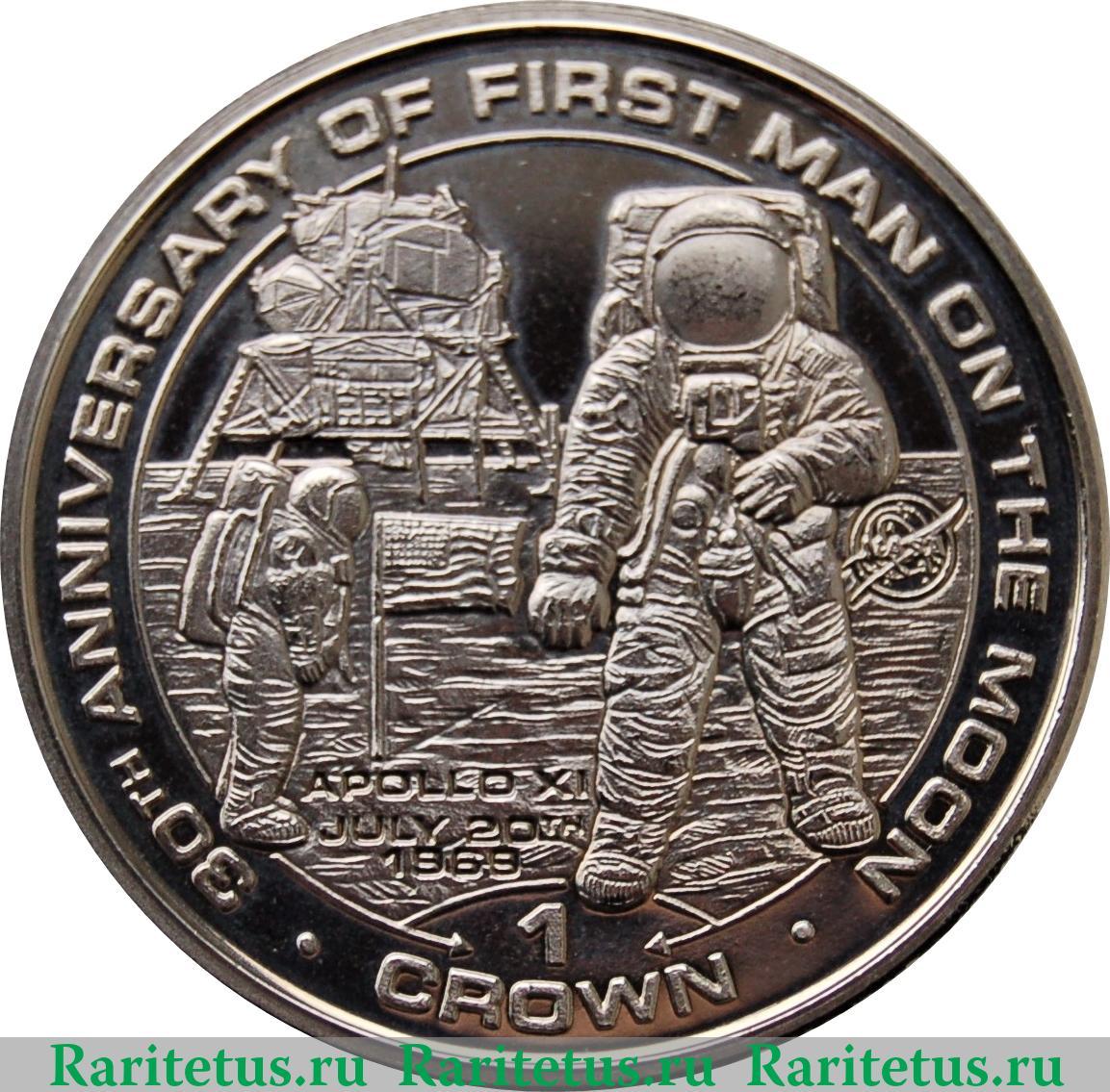 Изображена лунная поверхность, на которой прилунившийся лунный модуль. В правой части изображен вправо астронавт, перед ним флаг США, ниже надпись на английском языке «APOLLO XI JULY 20TH 1969» (Аполлон 11 20 июля 1969), в правой части изображен астронавт прямо, и эмблема НАСА. По окружности вдоль канта надписи на английском языке: сверху «30TH ANNIVERSARY OF FIRST MAN ON THE MOON» (30-летний юбилей первого человека на Луне), снизу в две строки - «1 CROWN» (1 крона), обрамленная по обе стороны точкой.