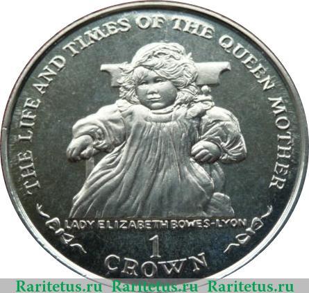 По центру изображена прямо сидя на стуле маленькая леди Елизавета Боуз-Лайон. Под изображением горизонтально надпись на английском языке «LADY ELIZABETH BOWES-LYON» (леди Елизавета Боуз-Лайон). По окружности вдоль канта надписи на английском языке: сверху - «THE LIFE AND TIMES OF THE QUEEN MOTHER» (Жизнь и время Королевы-матери), обрамленная по обе стороны бантом, снизу в две строки - «1 CROWN» (1 крона).
