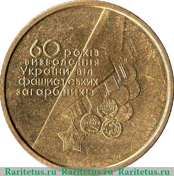 В центре изображение фрагмента мужского костюма с восемью наградами периода Великой Отечественной Войны под лацканом и, частично перекрывающая изображение, надпись в пять строк на укр. языке: «60 рокiв визволення Украïни вiд фашистских загарбникiв», которая переводится как: «60 лет освобождения Украины от фашистских захватчиков».