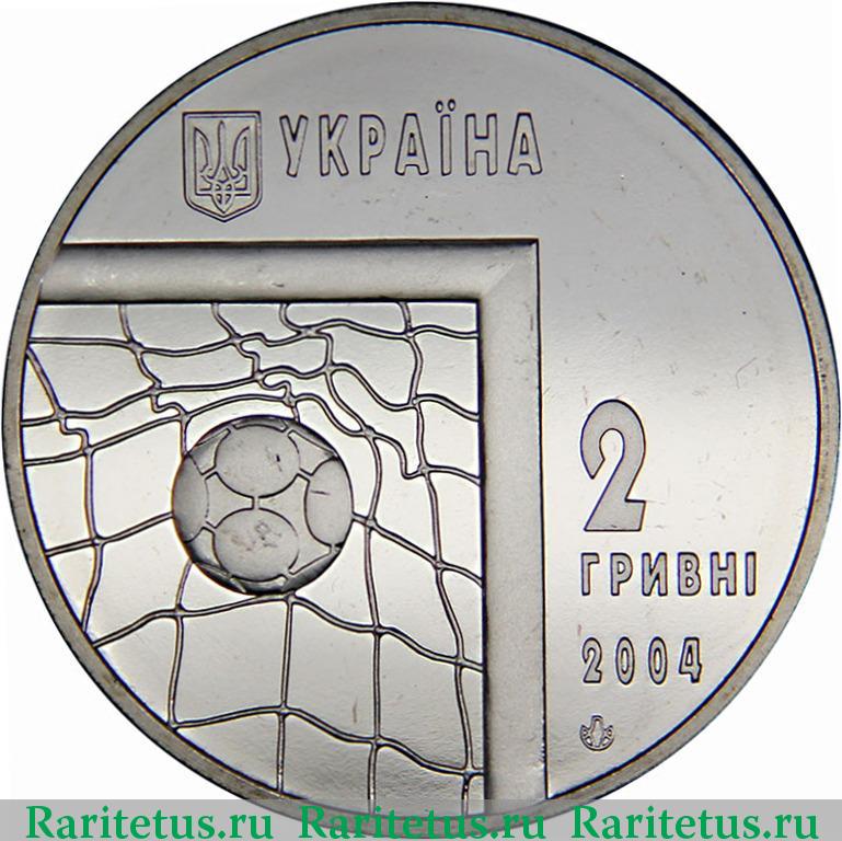 Изображен мяч в сетке ворот, вверху - малый Государственный Герб Украины и надпись УКРАИНА, справа от ворот размещены надписи: 2, гривны, 2004 и логотип Монетного двора Национального банка Украины.