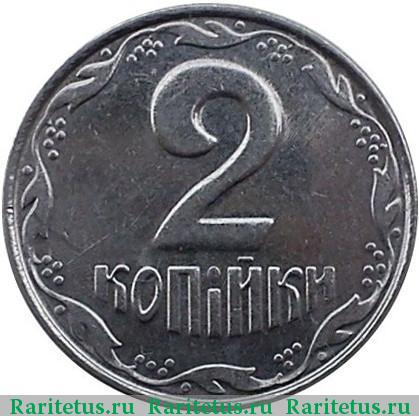 В центре обозначен номинал цифрой «2», ниже надпись «КОПiЙКИ». По кругу вдоль канта изображен стилизованный венок из ягод и волнообразно изогнутых листьев.