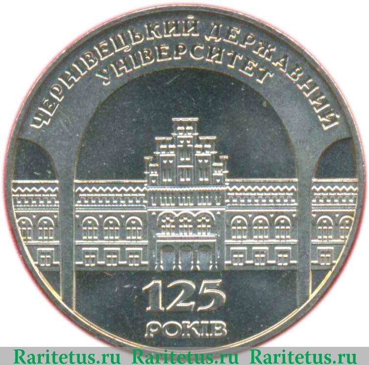 В центре изображено здание университета в г. Черновцы. Под ним надпись на укр. языке: «125 РОКIВ», в переводе: «125 лет». Сверху вдоль канта (на верхней части арки, стоящей на фоне здания) надпись в две строки на укр. яз.: «ЧЕРНIВЕЦЬКИЙ ДЕРЖАВНИЙ УНIВЕРСИТЕТ», которая переводится как: «Черновицкий государственный университет».