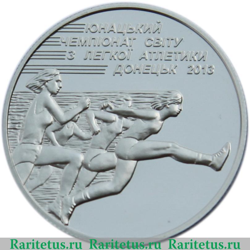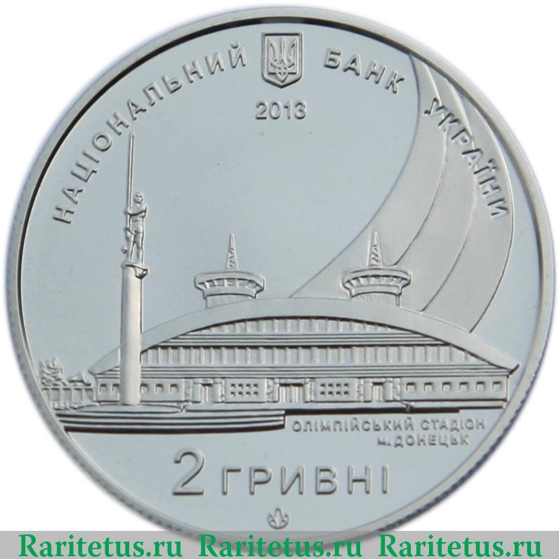 В центре изображено здание Олимпийского стадиона в г. Донецке, перед ним скульптура прыгуна в высоту, за ним три закругленных полосы, символизирующих беговую дорожку стадиона. Под стадионом надпись в две строки на украинском языке: «ОЛIМПIЙСКИЙ СТАДIОН м. ДОНЕЦЬК», в переводе: «Олимпийский стадион в г. Донецке». Под основанием скульптуры надпись: «2 ГРИВНI» - 2 гривны. Снизу вдоль канта знак монетного двора в Киеве. Слева, сверху и справа надпись на украинском языке: «НАЦIОНАЛЬНИЙ БАНК УКРАЇНИ», которая переводится как: «Национальный банк Украины». Надпись разделена гербом Украины. Под гербом год выпуска 2013.