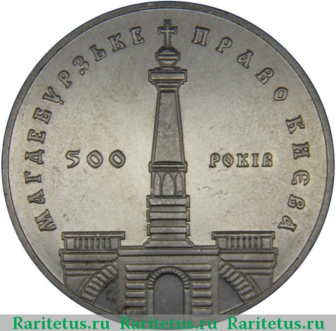 Монета посвящена 500-летию ввода в действие Магдебургского права в Киеве. Киев пользовался магдебургским правом с начала 15 в. Одна из уставных грамот великого князя литовского Александра подтверждала в 1499г. действие норм городского права, по которому административную власть над мещанами осуществляли члены выборных органов самоуправления и суда. Магдебургское право Киева сохранилось до 23 декабря 1834 года.