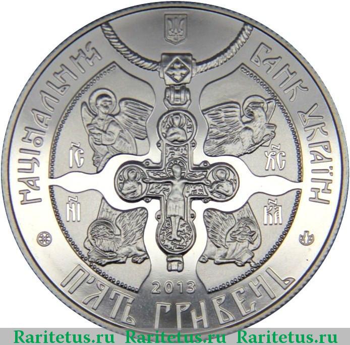 Малый Государственный Герб Украины, стилизованные надписи полукругом НАЦИОНАЛЬНЫЙ БАНК УКРАИНЫ (вверху), год чеканки монеты 2013 и номинал (внизу): ПЯТЬ ГРИВЕН, справа - логотип Монетного двора Национального банка Украины. В центре монеты изображена композиция - крест-энколпион и фигуры-символы четырех евангелистов: Матфея в образе ангела, Марка в образе льва, Луки в образе тельца, Иоанна в образе орла. Каждый из них с крыльями и держит Евангелие.