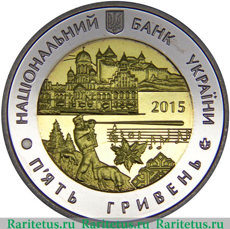 Вверху размещен малый Государственный Герб Украины, по кругу надписи: НАЦИОНАЛЬНЫЙ БАНК УКРАИНЫ (вверху), ПЯТЬ ГРИВЕН (внизу), справа логотип Монетного двора Национального банка Украины; вверху Трехсвятительская церковь Резиденции буковинских митрополитов на фоне Хотинской крепости; на переднем плане изображена композиция: на холме овцы и музыкант, играющий на трембите, под которой - стилизованные элементы: фрагменты нотной записи песни `Красная рута`, буковинского орнамента и цветок; справа над трембитой год чеканки монеты - 2015.