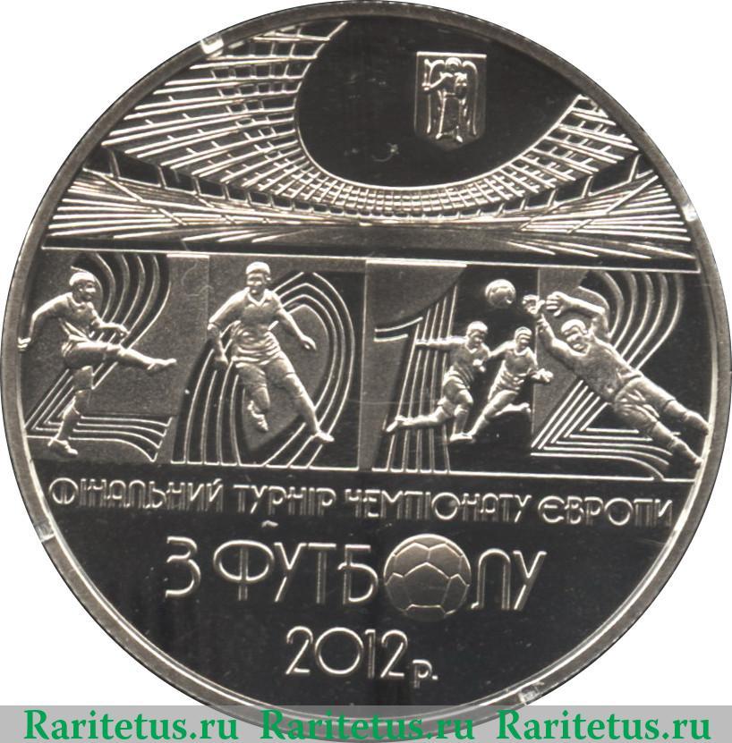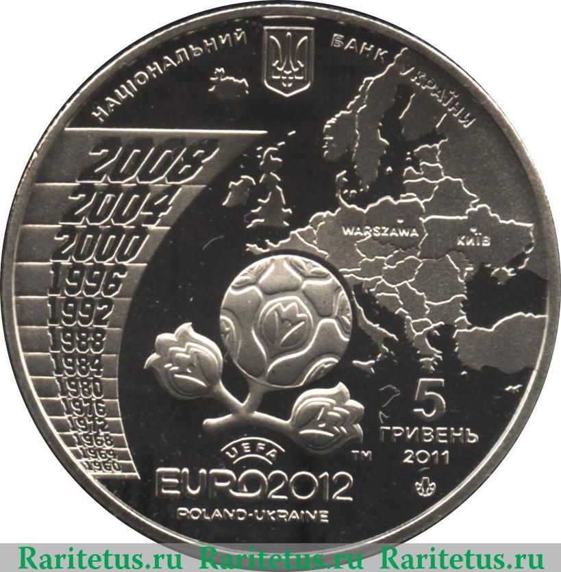 В центре изображен логотип Чемпионата Европы по футболу 2012 г., справа снизу от него надпись: «ТМ», снизу надпись на английском языке в три строки: «UEFA» - УЕФА, «EURO 2012» - Евро 2012 и «POLAND-UKRAINE» - Польша-Украина. Логотип частично закрывает, расположенный справа и сверху от него, контур Европы с выделением городов Варшава (WARSZAWA) и Киев (КИЇВ) соответственно на польском и украинском языках. Слева от логотипа, расположенные на идущих вдоль канта и увеличивающихся снизу вверх тринадцати полосах, годы с 1960 по 2008 с интервалом в четыре года. Под Европой надпись на укр. яз. в три строки: «5 ГРИВЕНЬ» - 5 гривен, год выпуска 2011 и знак монетного двора в Киеве. Слева, сверху и справа вдоль канта, разделенная изображением герба, надпись на украинском языке: «НАЦIОНАЛЬНИЙ БАНК УКРАЇНИ», которая переводится как: «Национальный банк Украины».