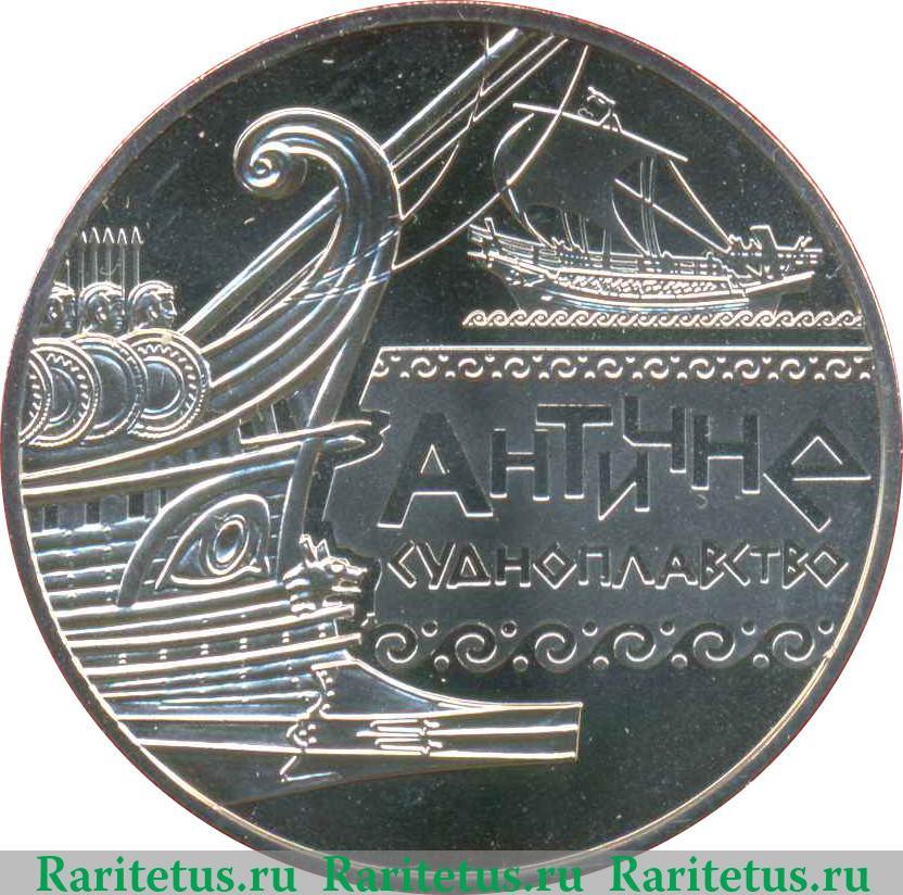 В центре изображение носовой части галеры вправо с воинами на борту. Справа от нее полоса, украшенная по краям декоративным узором из завитков и точек, с надписью на укр. языке: «АНТИЧНЕ СУДНОПЛАВСТВО», которая переводится как: «Античное судоходство». Над полосой изображение галеры, плывущей по морю влево.
