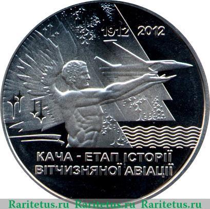 В центре стилизованное изображение моря, контуров самолета и звездного неба. На фоне изображения герб поселка Кача, и надпись в две строки на украинском языке: «5 ГРИВЕНЬ» - 5 гривен. Слева год выпуска 2012 и знак монетного двора в Киеве. Слева, сверху и снизу вдоль канта, разделенная гербом Украины, надпись: «НАЦIОНАЛЬНИЙ БАНК УКРАЇНИ», которая переводится как: «Национальный банк Украины».