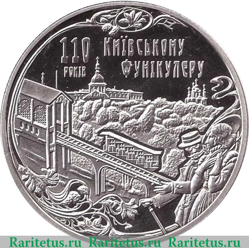 В центре изображен вид на Киевский фуникулер, справа от него мужчина и женщина в одежде начала прошлого века. Над видом надпись в четыре строки на укр. языке: «110 КИЇВСКОМУ ФУНIКУЛЕРУ», которая переводится как: «110 лет Киевскому фуникулеру». По окружности канта растительный орнамент.
