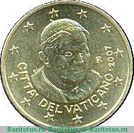 Справа год выпуска 2007 и буква «R» – минцмарка Монетного двора. В центре портрет папы Бенедикта XVI анфас и надписи на ит. яз: «М.А.С. INC» – личный знак гравера Марии Анджелы Кассоль и подпись художника Даниэла Лонго «D.L.».