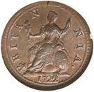 В центре, в круге меньшего диаметра, изображение Британии - персонифицированного символа Британии. Под ним год выпуска 1722. По окружности канта надписи на англ. языке: название страны «BRITANNIA.» и декоративные элементы в виде зубцов.
