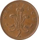 В центре изображен герб принца Уэльского, под ним цифра «2», сверху вдоль канта надпись на англ. языке: «NEW PENCE» - 2 новых пенса. По окружности канта декоративные элементы в виде точек.