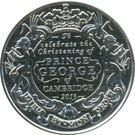 В центре декоративная овальная рамка, состоящая из короны, двух ангелочков, растительных элементов и девизом на англ. языке: «DIEU ET.MON DROIT», в переводе: «Бог и моё право». В ней надпись на англ. яз.: «To celebrate the Christening of PRINCE GEORGE of CAMBRIDGE 2013», которая переводится как: «Празднование Крещения принца Джорджа Кембриджского 2013 г.».