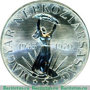 В центре изображена статуя Свободы на горе Геллерт в г. Будапешт (Венгрия), символически стоящая на восходящем солнце. Слева от статуи 1945, справа 1970. Ниже три пятиконечных звезды. По окружности канта надпись «MAGYAR NÉPKÖZTÁRSASÁG», которая переводится с венг. языка, как: «Венгерская Народная Республика».
