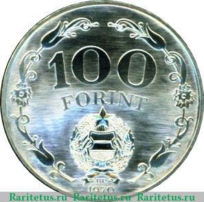 В центре надпись на венгерском в две строки 100 «FORINT» - 100 форинтов. Ниже герб Венгерской Народной Республики, под гербом аббревиатура «ВР.» - указание монетного двора в Будапеште. Снизу вдоль канта год выпуска 1970. Всю композицию обрамляет расположенный вдоль канта венок из цветов и листьев.