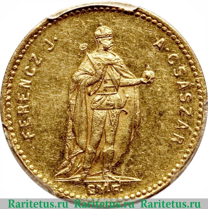 В центре ростовой портрет вправо короля Франса Иосифа I в короне, с державой в левой руке и скипетром в правой. Слева вдоль канта надпись: «FERENCZ J.», справа вдоль канта: «A. CSÁSZÁR», в переводе с немецкого: «Франс Иосиф Император Австрии». Снизу под фигурой короля аббревиатура «GY.F», указание монетного двора в Карлсбурге. По окружности канта рельефные элементы в виде точек.
