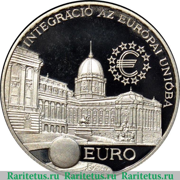 В центре изображение здания Парламента Венгрии в г. Будапеште, с правой стороны от которого изображен знак Евро в обрамлении 12 звезд. Ниже размещена надпись «EURO» - Евро. Сверху вдоль канта надпись: «INTEGRACIO AZ EUROPAI UNIOBA», которая переводится с венг., как: «Интеграция в Европейский Союз».
