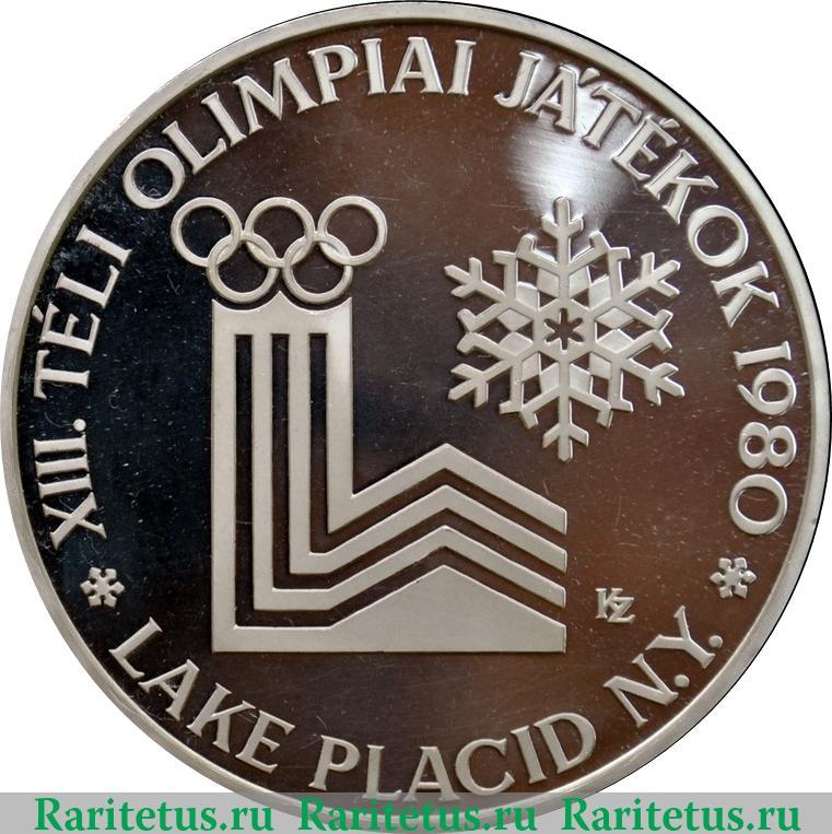 Вдоль канта надпись: «XIII. TÉLI OLIMPIAI JA'TÉKOK 1980», в переводе с венг. «XIII зимние Олимпийские игры 1980 г.». Под ними: «LAKE PLACID N.Y.» - Лэйк-Плэсид, штат Нью-Йорк. Надписи разделены между собой изображениями снежинок. В центре символ данных игр: снежная гора с вышкой, увенчанной олимпийскими кольцами, и снежинка. Справа от символа знак гравера.