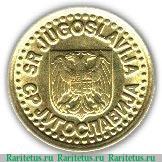 По центру герб Союзной Республики Югославии. Представляет собой геральдический щит, на котором изображен двуглавый орел, на груди которого четырех частный щит. По обе стороны от эмблемы полукругом название страны «Социалистическая Республика Югославия»: сверху на словенском «SR JUGOSLAVIJA», снизу на сербском «СР ЈУГОСЛАВИЈА» языках. По окружности канта элементы в виде точек.