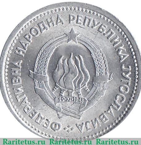По центру изображен герб Федеративной Народной Республики Югославия. Представляет собой: пять горящих факелов, над которыми пятиконечная звезда, справа и слева колосья пшеницы, опоясанные снизу лентой, на которой дата «29-XI-1943». По окружности надпись на сербском языке «ФЕДЕРАТИВНА НАРОДНА РЕПУБЛИКА JУГОСЛАВИJА» (Федеративная Народная Республика Югославия). Снизу четыре ромба, образующие ромб. По окружности канта элементы в виде точек.