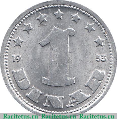 В центре цифра «1», по обе стороны от которой разбитый на две части год выпуска: слева «19», справа «53» (1953). Сверху расположены полукругом семь пятиконечных звезд, снизу надпись на словенском языке «DINAR» (Динар). Вдоль канта элементы в виде точек.